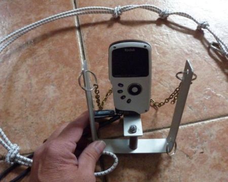 Zum Einsatz kommt eine billige Kodak-Digicam C613. Mit einer 8 GB-Karte lassen sich so Videos von 2x 2 Std. mit 640x480 aufnehmen. Versuche mit einer hochwertigen Panasonic Kamera waren frustran. Der Verwackelungsschutz versucht die Vibrationen auszugleichen, was nicht gelingt. Solche Videos kann man nicht betrachten.