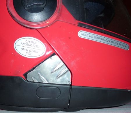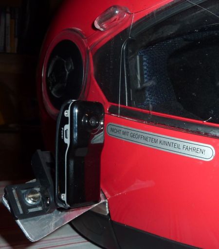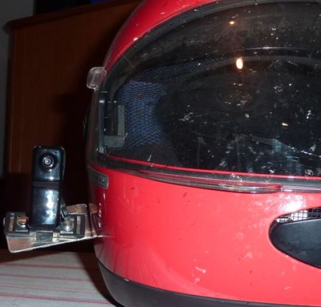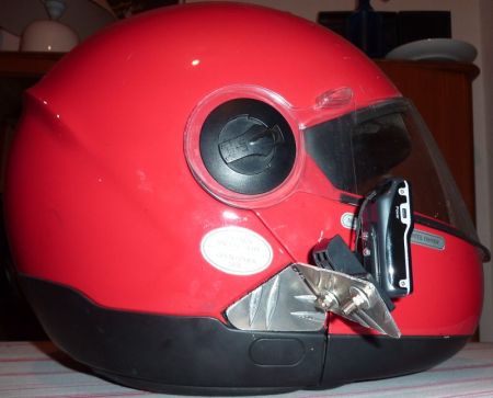 Ein Stück Aluriffelblech wurde entsprechend gesägt und gebogen, so dass es mit kräftigem Klettband an einem Schuberth Klapphelm befestigt werden kann. Die SpyCam wurde mit der Originalhalterung auf die Platte geschraubt. Die Halterung hält bis min. 120 km/h. Ab dieser Geschwindigkeit wird eher der Druck auf den Kopf lästig.