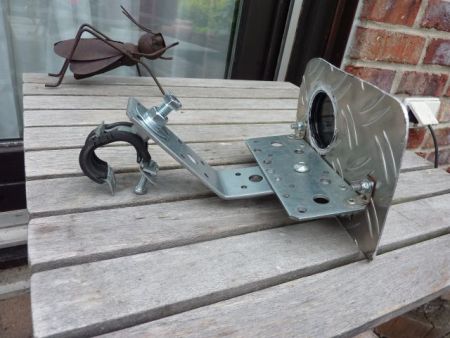 Um die Windgeräusche wirksam eliminieren zu können, muss das externe Mikrofon nahe an das Auspuffende gebracht und gegen den Fahrtwind abgeschirmt werden. Hierfür habe ich ein Alublech genommen und mit einer kleinen Schraubzwinge versehen. Hiermit kann ich die Konstruktion an einen Winkel hinter dem Nummernschild klemmen.